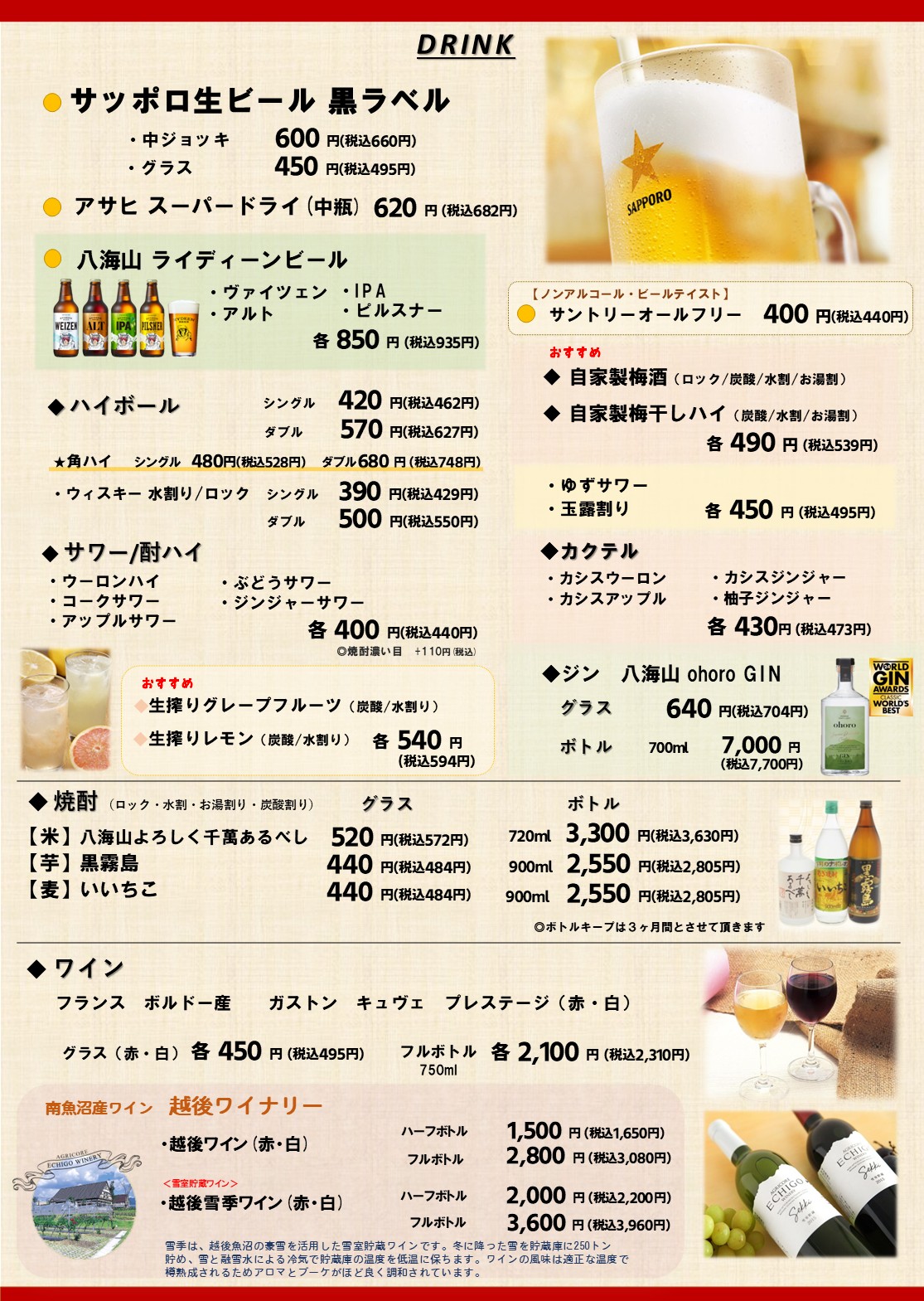 魚沼産コシヒカリ・日本海の幸・お鮨・そば・地酒・ステーキから洋食と幅広いメニュー。接待・ビジネス・ご家族で!